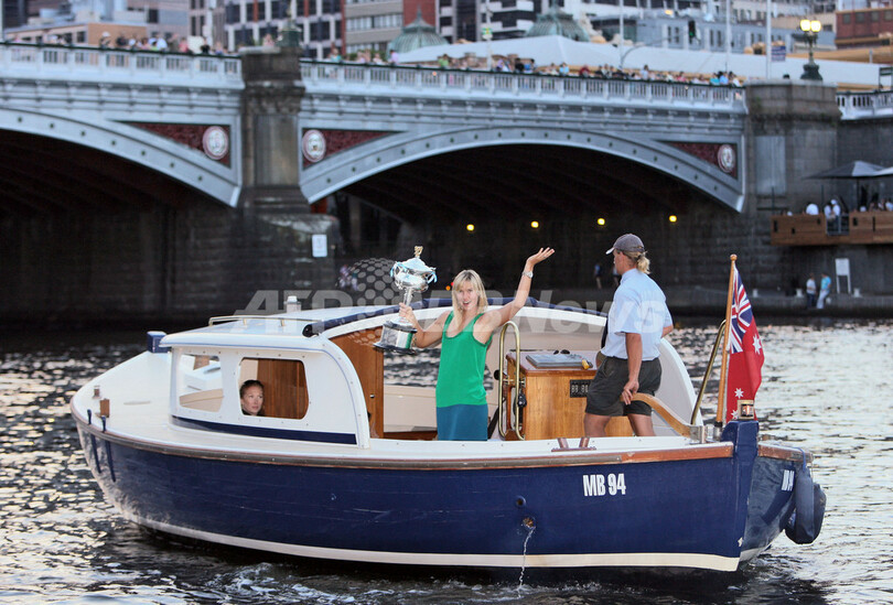 【1月26日 AFP】テニス、全豪オープン(Australian Open tennis tournament 2008)・女子シングルス決勝で大会第4シードのアナ・イワノビッチ(Ana Ivanovic、セルビア)をセットカウント2-0(7-5、6-3)のストレートで降し、全豪初制覇を果たした大会第5シードのマリア・シャラポワ(Maria Sharapova、ロシア)は、試合後にメルボルン市内を流れるヤラ川(Yarra river)で記念写真撮影に臨んだ。(c)AFP