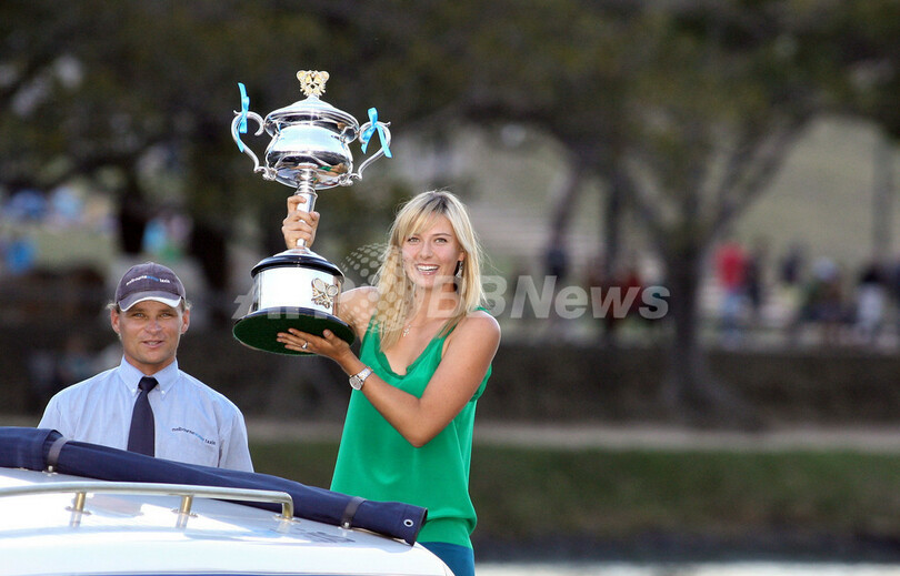 【1月26日 AFP】テニス、全豪オープン(Australian Open tennis tournament 2008)・女子シングルス決勝で大会第4シードのアナ・イワノビッチ(Ana Ivanovic、セルビア)をセットカウント2-0(7-5、6-3)のストレートで降し、全豪初制覇を果たした大会第5シードのマリア・シャラポワ(Maria Sharapova、ロシア)は、試合後にメルボルン市内を流れるヤラ川(Yarra river)で記念写真撮影に臨んだ。(c)AFP