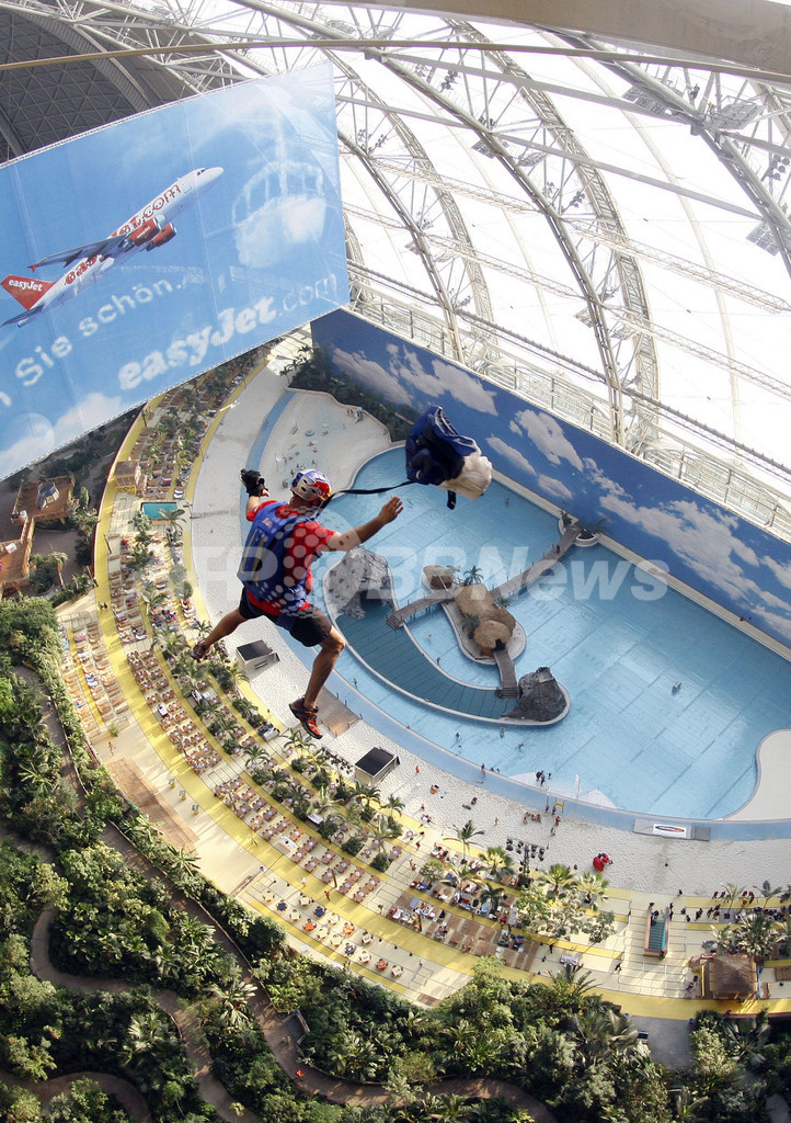 【1月27日 AFP】ドイツの首都ベルリン(Berlin)近郊にある欧州最大のドーム型人工熱帯雨林テーマパーク「トロピカル・アイランズ・リゾート(Tropical Islands Resort)」で25日、インドア・ベースジャンプの世界選手権(Indoor Base World Cup)が開催された。ベースジャンプとは、高層ビルや断崖絶壁といった高所からダイブするスポーツ。