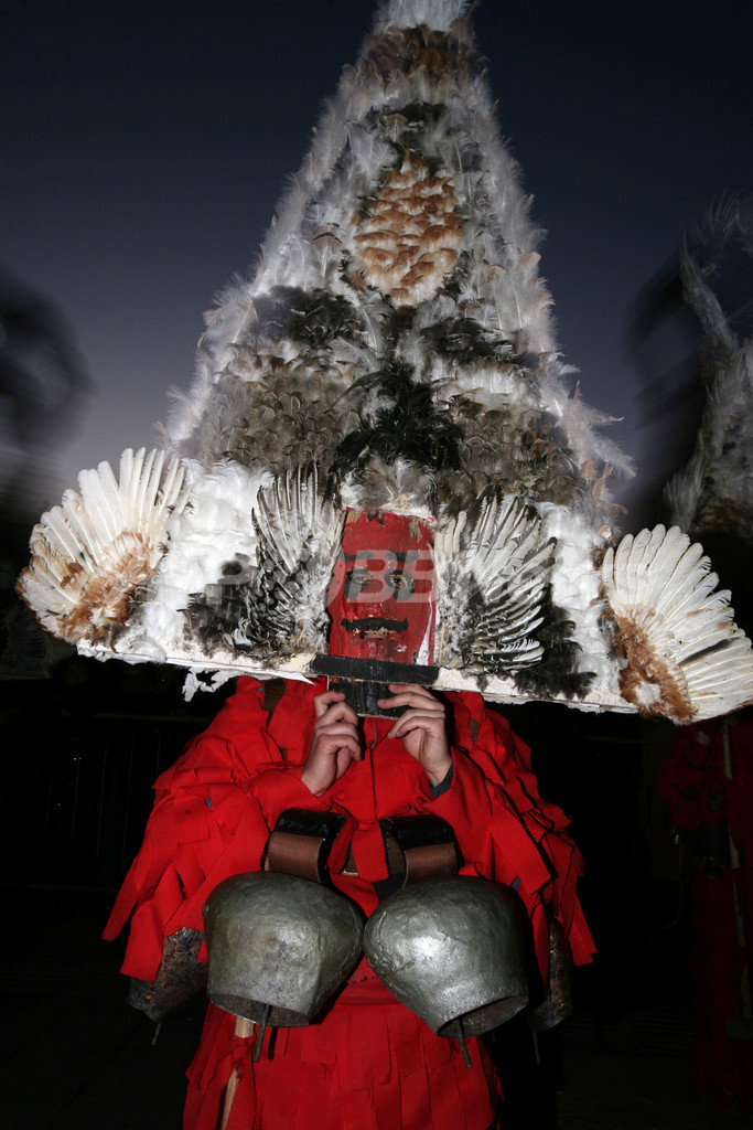 【1月28日 AFP】(1月29日 写真追加)ブルガリアの首都ソフィア(Sofia)近郊のペルニック(Pernik)で25日から3日間、「International Festival of the Masquerade Games(国際仮面フェスティバル)」が開催された。主役を演じるダンサーが病気や悪霊を追い払う鐘を鳴らしたり、麦の実った穂を揺らす中、多くの人たちが色とりどりの仮面を着け、ビーズやリボン、飾り房などをまとってフェスティバルに参加した。(c)AFP