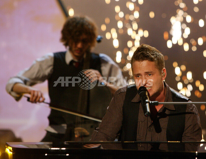 2008年1月26日、ドイツのTV番組「Wetten,dass...?」に出演する米ロックバンド、ワン・リパブリック(%%One Republic%%)のボーカル、ライアン・テッダー(%%Ryan Tedder%%)。(c)AFP/DDP/POOL/PATRICK SEEGER