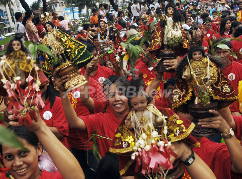 ニュース ライフ フィリピン各地でサント・ニーニョ祭 2008年1月30日 17:59 発信地:マニラ/フィリピン [ アジア・オセアニア フィリピン ] このニュースをシェア ‹ › ❮ 4/4 ❯ 2008年1月27日、フィリピンの首都マニラ(Manila)で幼年期のイエス・キリスト(Jesus Christ)、サントニーニョ(Santo Nino)像を掲げてサントニーニョ祭のパレードに参加する地元住民ら。(c)AFP/JES AZNAR 画像作成中 ! 【1月30日 AFP】フィリピン各地で27日、キリスト教カトリックのサントニーニョ(Santo Nino)祭が行われ、首都マニラ(Manila)でもカトリック教徒らが幼年期のキリスト像サントニーニョを掲げながら市内をパレードした。(c)AFP ライフ 一覧へ> メディア・報道関係・法人の方向け 写真・動画 購入のお問合せ>