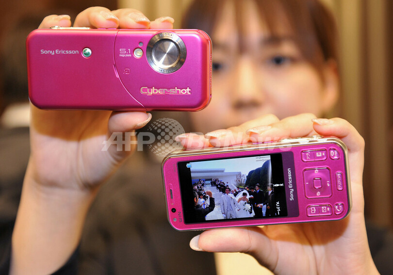 【1月28日 AFP】携帯電話大手KDDIは28日、au向け携帯端末の春の新ラインナップ、10機種を発表した。世界初の3インチフルワイド有機ELディスプレーを搭載した三洋電気(Sanyo Electric)製「W61SA」や、ソニー(Sony)製デジタルカメラを採用したソニー・エリクソン(Sony Ericsson Mobile Communicatons)製「Cyber-shotケータイ W61S」などが披露された。「Cyber-shotケータイ W61S」は有効511万画素のCMOSセンサーや4.5-13.5ミリズームレンズを搭載している。(c)AFP