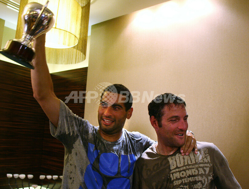 【1月29日 AFP】テニス全豪オープン(Australian Open Tennis Tournament 2008)の男子ダブルス決勝で大会第7シードのアルノー・クレマン(Arnaud Clement、フランス)/ミカエル・ロドラ(Michael Llodra、フランス)組をセットカウント2-0(7-5、7-6)のストレートで破り優勝を果たしたイスラエルのジョナサン・アーリック(Jonathan Erlich)とアンディ・ラム(Andy Ram)は現地28日、イスラエルのベン・グリオン(Ben Gurion)国際空港に到着し記者会見を行った。(c)AFP