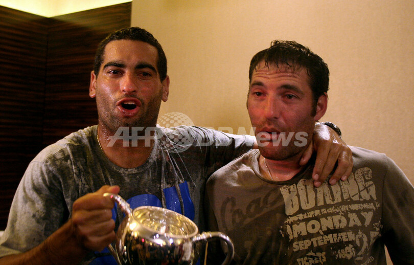 【1月29日 AFP】テニス全豪オープン(Australian Open Tennis Tournament 2008)の男子ダブルス決勝で大会第7シードのアルノー・クレマン(Arnaud Clement、フランス)/ミカエル・ロドラ(Michael Llodra、フランス)組をセットカウント2-0(7-5、7-6)のストレートで破り優勝を果たしたイスラエルのジョナサン・アーリック(Jonathan Erlich)とアンディ・ラム(Andy Ram)は現地28日、イスラエルのベン・グリオン(Ben Gurion)国際空港に到着し記者会見を行った。(c)AFP