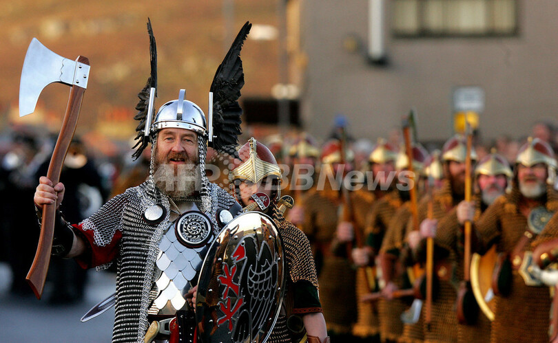 夜通し行われる祭りには、島民たちが鉄かぶとに鎖かたびら、手斧といった完璧な「ノースマン(バイキング)」のいでたちで参加した。