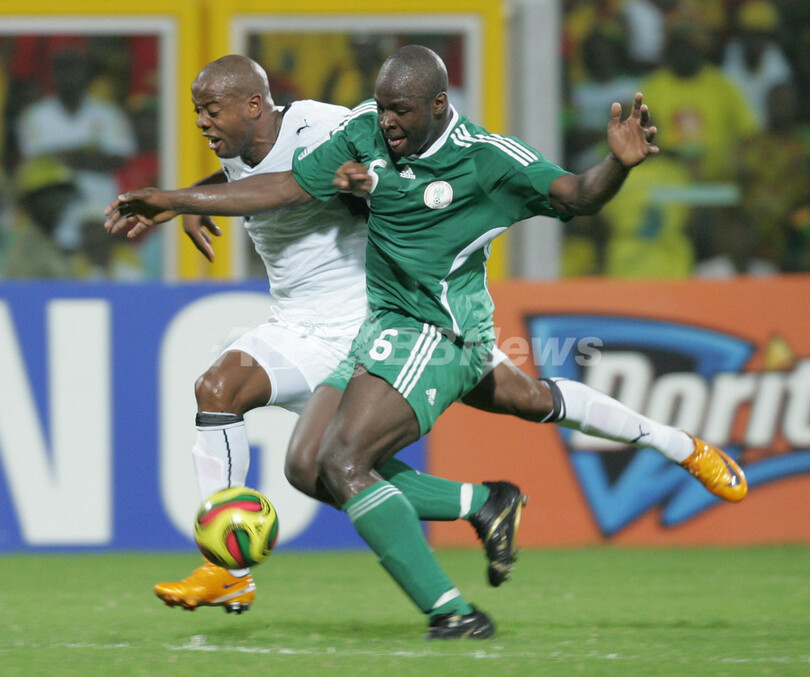 前半35分にナイジェリアのヤクブ・アイェグベニ(Yakubu Ayegbeni)にPKで先制を許すも、前半ロスタイムにミカエル・エシアン(Michael Essien)がゴールを挙げて同点に追いついたガーナは、後半15分にキャプテンのジョン・メンサーが退場となったものの勢いが止まることはなく、後半38分にジュニア・アゴゴ(Manuel "Junior" Agogo)が決勝点を挙げ、開催国が勝ち進んだ。(c)AFP/Nick Reeves