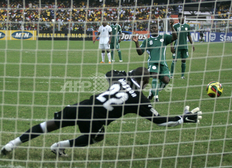 前半35分にナイジェリアのヤクブ・アイェグベニ(Yakubu Ayegbeni)にPKで先制を許すも、前半ロスタイムにミカエル・エシアン(Michael Essien)がゴールを挙げて同点に追いついたガーナは、後半15分にキャプテンのジョン・メンサーが退場となったものの勢いが止まることはなく、後半38分にジュニア・アゴゴ(Manuel "Junior" Agogo)が決勝点を挙げ、開催国が勝ち進んだ。(c)AFP/Nick Reeves