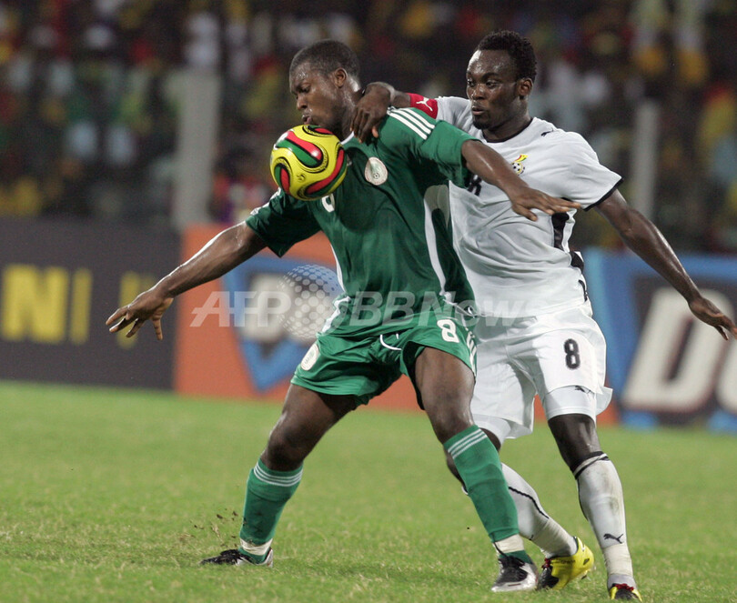 前半35分にナイジェリアのヤクブ・アイェグベニ(Yakubu Ayegbeni)にPKで先制を許すも、前半ロスタイムにミカエル・エシアン(Michael Essien)がゴールを挙げて同点に追いついたガーナは、後半15分にキャプテンのジョン・メンサーが退場となったものの勢いが止まることはなく、後半38分にジュニア・アゴゴ(Manuel "Junior" Agogo)が決勝点を挙げ、開催国が勝ち進んだ。(c)AFP/Nick Reeves