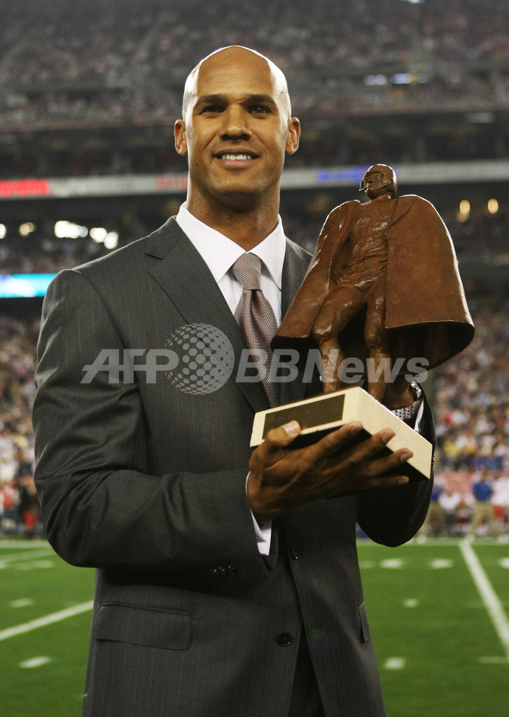 【2月4日 AFP】07NFL第42回スーパーボウル(Super Bowl XLII)、ニューイングランド・ペイトリオッツ(New England Patriots)対ニューヨーク・ジャイアンツ(New York Giants)の試合開始前に、フィールド内での活躍はもちろんのこと、フィールド外での活動も積極的に行った選手に贈られる「ウォルター・ペイトン賞(Walter Payton Man of the Year)」の授賞式が行なわれ、マイアミ・ドルフィンズ(Miami Dolphins)のDEジェイソン・テイラー(Jason Taylor)が受賞した。(c)AFP/Getty Images