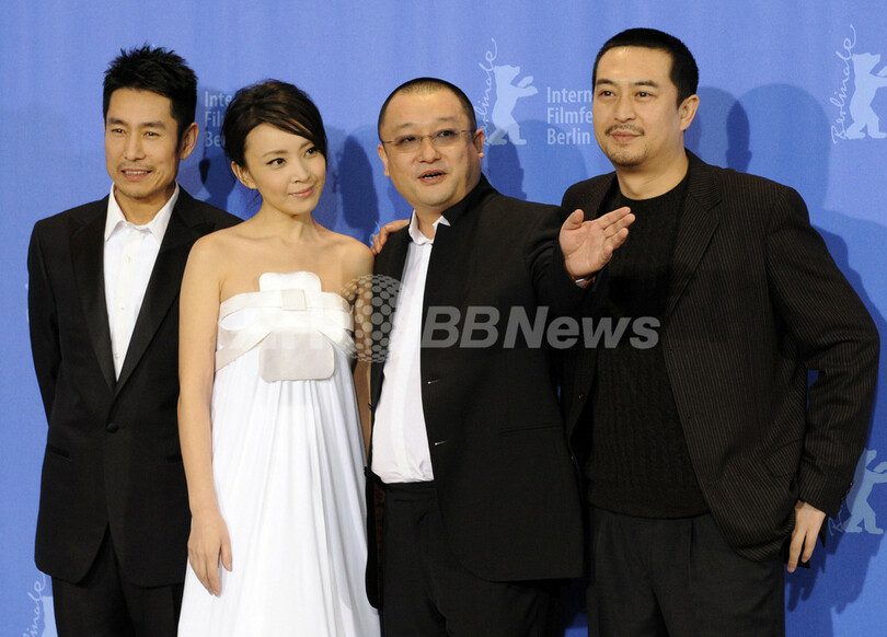 2008年2月8日、ドイツ、ベルリン(Berlin)で開催されている「第58回ベルリン国際映画祭(The 58th Berlin International Film Festival)」2日目に行われた、映画『In Love We Trust』のフォトコールに登場した、(左から)出演俳優の%%Cheng Taisheng%%、出演女優のLiu Weiwei、ワン・シャオシュアイ(%%Wang Xiaoshuai%%)監督、出演俳優の%%Zhang Jia-yi%%。(c)AFP/DDP/AXEL SCHMIDT