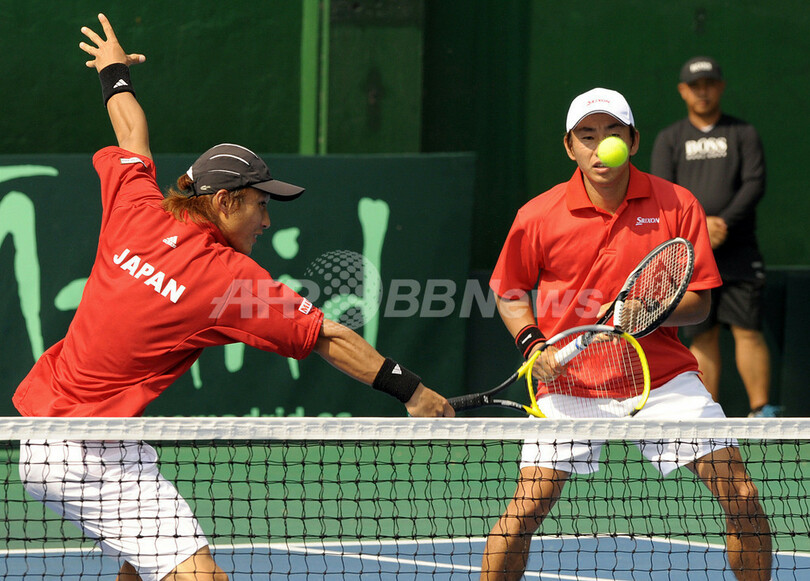 【2月9日 AFP】男子テニス・デビスカップ(2008 Davis Cup)・アジア・オセアニアゾーン・グループⅠ・1回戦、フィリピンvs日本。日本の添田豪(Go Soeda)/鈴木貴男(Takao Suzuki)組は、第3試合のダブルスでフィリピンのセシル・マミット(Cecil Mamiit)/エリック・タイノ(Eric Taino)組と対戦。添田/鈴木組はセットカウント3-1(6-7、7-6、7-6、6-4)でマミット/タイノ組を降し、日本は3連勝でアジア・オセアニアゾーン・グループⅠ・2回戦進出を決めた。(c)AFP