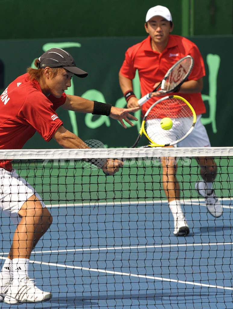 【2月9日 AFP】男子テニス・デビスカップ(2008 Davis Cup)・アジア・オセアニアゾーン・グループⅠ・1回戦、フィリピンvs日本。日本の添田豪(Go Soeda)/鈴木貴男(Takao Suzuki)組は、第3試合のダブルスでフィリピンのセシル・マミット(Cecil Mamiit)/エリック・タイノ(Eric Taino)組と対戦。添田/鈴木組はセットカウント3-1(6-7、7-6、7-6、6-4)でマミット/タイノ組を降し、日本は3連勝でアジア・オセアニアゾーン・グループⅠ・2回戦進出を決めた。(c)AFP