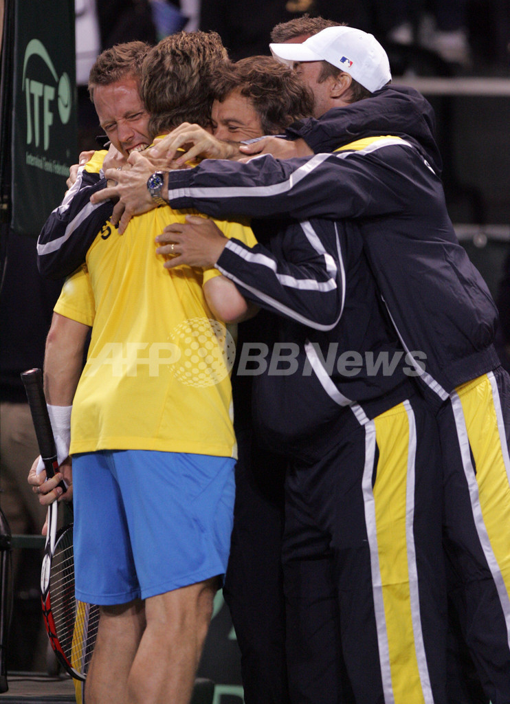 【2月11日 AFP】男子テニス・デビスカップ(2008 Davis Cup)・ワールドグループ2008・1回戦、イスラエルvsスウェーデン。スウェーデンのヨナス・ビヨークマン(Jonas Bjorkman) は、第5試合のシングルスでハレル・レビ(Harel Levy)と対戦。ビヨークマンはセットカウント3-1(0-6、6-4、6-3、7-6)でレビを降し、スウェーデンは3勝目を挙げて同グループ準々決勝への進出を決めた。(c)AFP