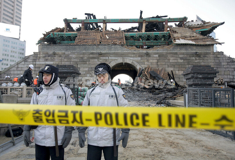 一方、南大門に夜間の警備員が配備されておらず、消火設備も設置されていなかったことから地元当局に対する非難の声が高まっている。コリア・タイムズ(Korea Times)は、消防隊は速やかに屋根を破壊して火元に突入すべきだったとして消火活動は「アマチュア的」だったとの批判を展開した。これに対して消防当局は、文化財庁から建物を必要以上に破壊しないよう要請があったことを明らかにし、建物の図面もなかったと反論した。(c)AFP/Jun Kwanwoo