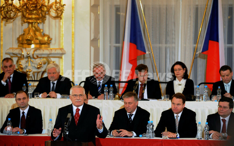 クラウス大統領は、上下両院議員から141票を得票、経済学者ヤン・シュベイナル(Jan Svejnar)氏を抑えて当選した。(c)AFP