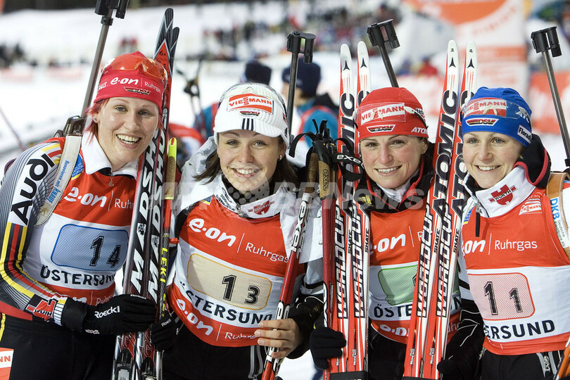 【2月18日 AFP】バイアスロン世界選手権2008(Biathlon World Championship 2008)、女子4x6キロメートルリレー。ドイツは1時間10分12秒6を記録して優勝を果たした。