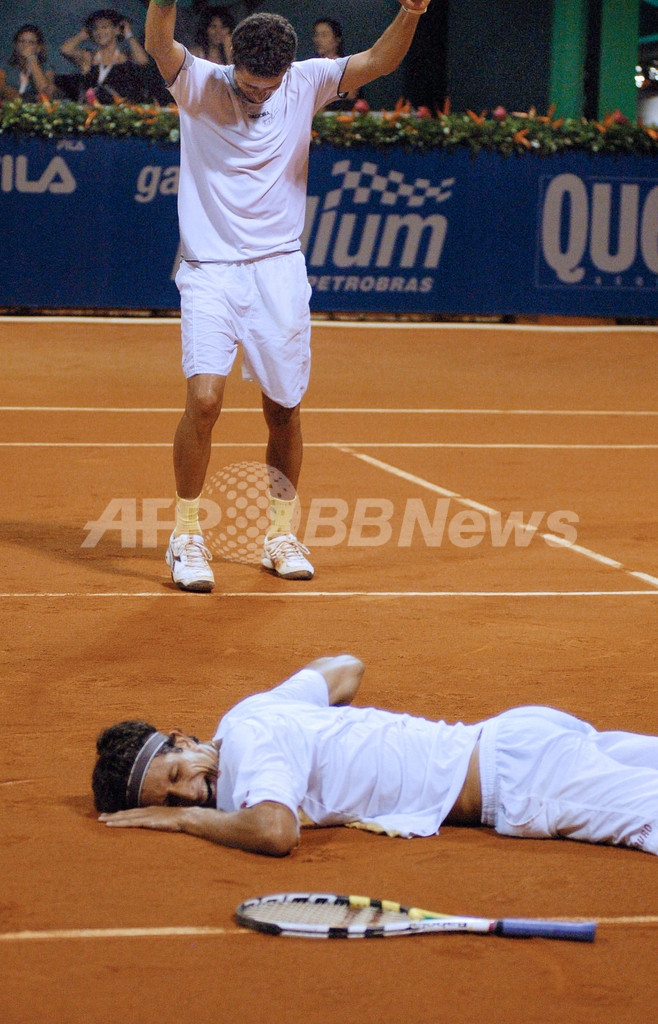 【2月18日 AFP】男子テニス、ブラジル・オープン2008(Brazil Open 2008)ダブルス決勝。大会第1シードのマルセロ・メロ(Marcelo Melo、ブラジル)/アンドレ・サ(Andre Sa、ブラジル)組は、スペインのアルベルト・モンタネス(Albert Montanes)/サンティアゴ・ベンチュラ(Santiago Ventura)組と対戦。メロ/サ組はセットカウト2-1(4-6、6-2、10-7)で勝利を収め優勝を果たした。(c)AFP