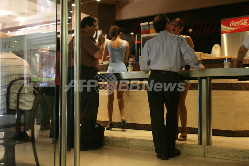 【2月19日 AFP】チリの首都サンティアゴ(Santiago)では、「Cafe con Piernas(脚のカフェ)」と呼ばれる飲食店の人気が男性の間で高まっており、店舗数も急増している。露出度の高い衣装のウエートレスたちが、コーヒーなどの飲料とおしゃべりをサービスするのが特徴。こうしたカフェに雇われている女性はサンティアゴ市内で1000人近くおり、その中にはチリ人だけでなく外国人女性も含まれている。カフェのウエートレスの職を得るために美容整形手術を受ける女性の数も増えつつあり、雇い主が手術を受けるように勧め、病院を手配するケースさえあるという。(c)AFP