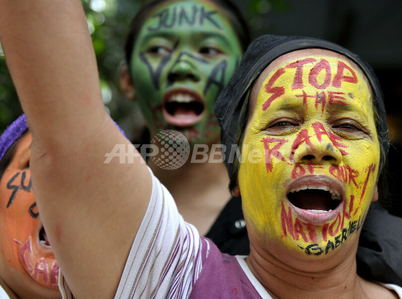 ニュース 政治・経済 マニラ、顔にペインティングを施して米軍に抗議 2008年2月23日 7:25 発信地:マニラ/フィリピン [ アジア・オセアニア フィリピン ] このニュースをシェア ‹ › ❮ 7/8 ❯ フィリピン・マニラ(Manila)郊外で、顔に抗議内容を記したペインティングを施し、フィリピン領内での米軍の活動に抗議する女性ら(2008年2月19日撮影)。(c)AFP/Jay DIRECTO 画像作成中 ! 【2月23日 AFP】フィリピンでは、今月18日から3月3日までの予定で、米軍とフィリピン軍による年に1度の合同軍事演習が行われている。この演習は米軍から約6000人が参加してフィリピン全土で行われるものだが、演習開始翌日の19日には、首都マニラ(Manila)郊外で住民らによる抗議活動も行われた。(c)AFP 政治・経済 一覧へ> メディア・報道関係・法人の方向け 写真・動画 購入のお問合せ>