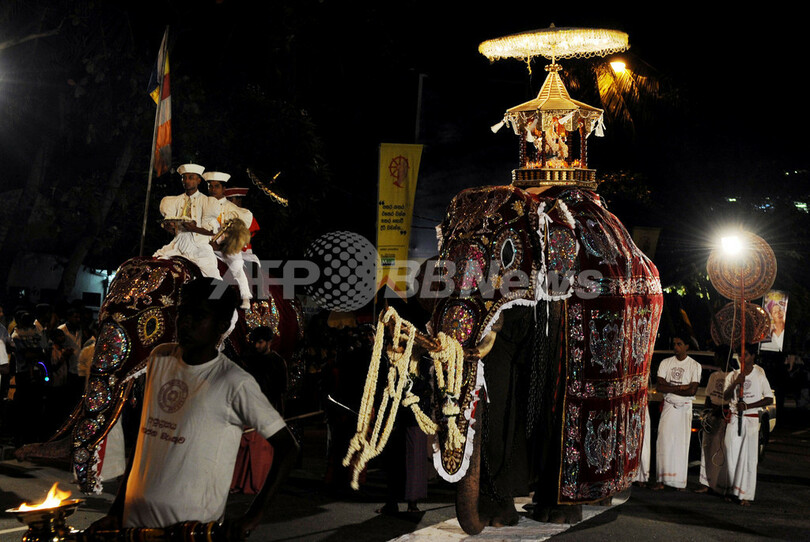 全国各地から僧侶や鼓手、踊り子に加え、調教されたゾウも集結し、市内をパレードした。この行事は1979年から行われている。(c)AFP