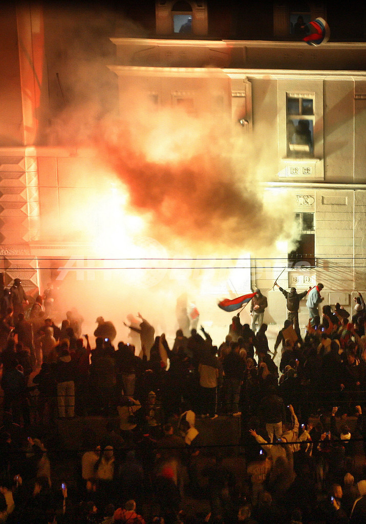 現地のAFP記者によると、フードやスカーフで顔を隠した数百人の若者らが、Kneza Milosa通りにある米大使館に侵入し、火を放ったという。
