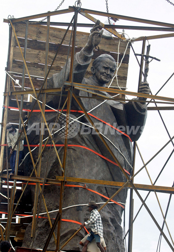 【2月28日 AFP】東ティモールの首都ディリ(Dili)にある丘で21日、前ローマ法王の故ヨハネ・パウロ2世(John Paul II)像を建立工事の最後の仕上げが行われた。重さ6トンのこの像は、Alves Andre氏がデザインを手掛け、海抜200メートルの場所に立てられている。全人口の90パーセントがカトリック教徒である東ティモールは以前、イスラム教徒が大半を占めるインドネシアの支配下にあった。独立前の1980年代の当時、前法王は東ティモールを訪問した。そのため、同国内での人気が高い。(c)AFP