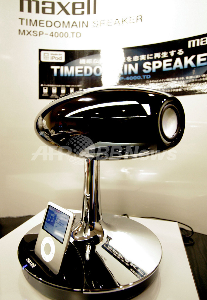 【2月26日 AFP】横浜で23日に開幕した毎年恒例のA&Vフェスタ(AV festa)で25日、日立マクセル(Hitachi Maxell)がタイムドメインスピーカーとしては初めてiPodドックコネクタを搭載した「MXSP-4000.TD」を発表した。両端にスピーカーを配したラグビーボール型の同機は、タイムドメイン社の由井啓之(Hiroyuki Yoshii)氏の提唱するタイムドメイン理論を採用したもので、クリアでパワフルなサウンドが特徴。(c)AFP