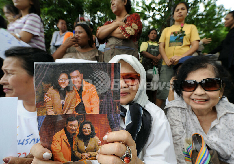 同日朝、タイ航空(Thai Airways)603便で香港を出発した元首相は、午前9時38分にバンコク(Bangkok)国際空港に到着。一万人以上の熱狂的な支持者に迎えられながら、ひざまづいて母国の大地に口づけし、帰国を祝った。