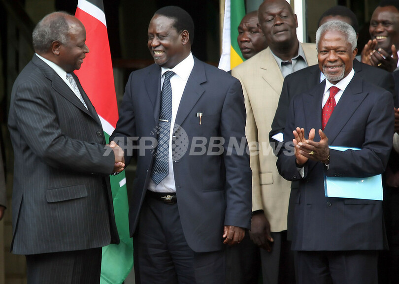 【2月29日 AFP】ケニアのムワイ・キバキ(Mwai Kibaki)大統領と野党オレンジ民主運動(Orange Democratic Movement、ODM)のライラ・オディンガ(Raila Odinga)党首は28日、コフィ・アナン(Kofi Annan)前国連(UN)事務総長らの立ち会いの下、連立政権樹立にむけた合意文書に正式に調印した。