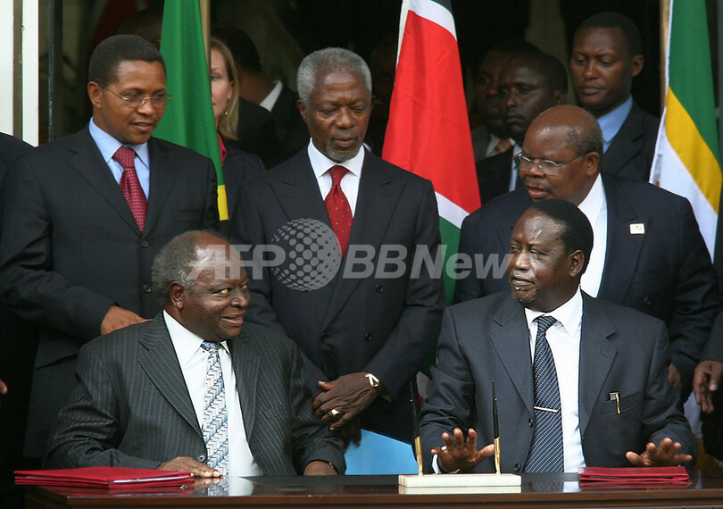 【2月29日 AFP】ケニアのムワイ・キバキ(Mwai Kibaki)大統領と野党オレンジ民主運動(Orange Democratic Movement、ODM)のライラ・オディンガ(Raila Odinga)党首は28日、コフィ・アナン(Kofi Annan)前国連(UN)事務総長らの立ち会いの下、連立政権樹立にむけた合意文書に正式に調印した。