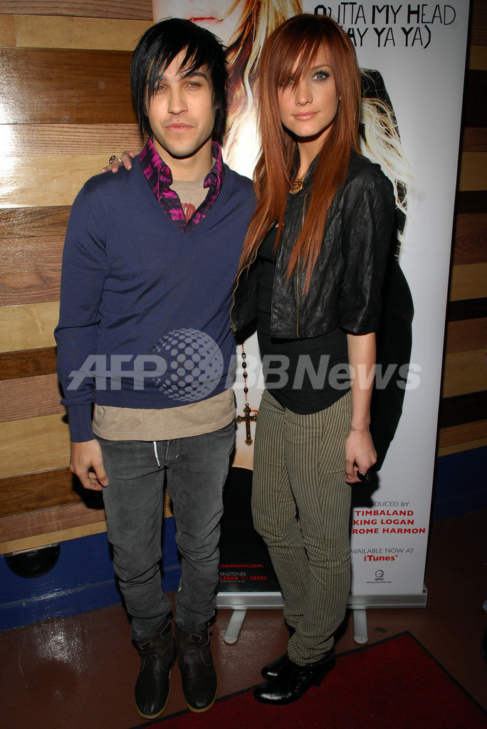 2008年2月26日、ニューヨーク市内のクラブ、Marqueeでニューアルバム『Bittersweet World』のパフォーマンスを行った歌手のアシュリー・シンプソン(Ashlee Simpson、右)と恋人のピート・ウェンツ(Pete Wentz)。(c)AFP/Getty Images/Rob Loud