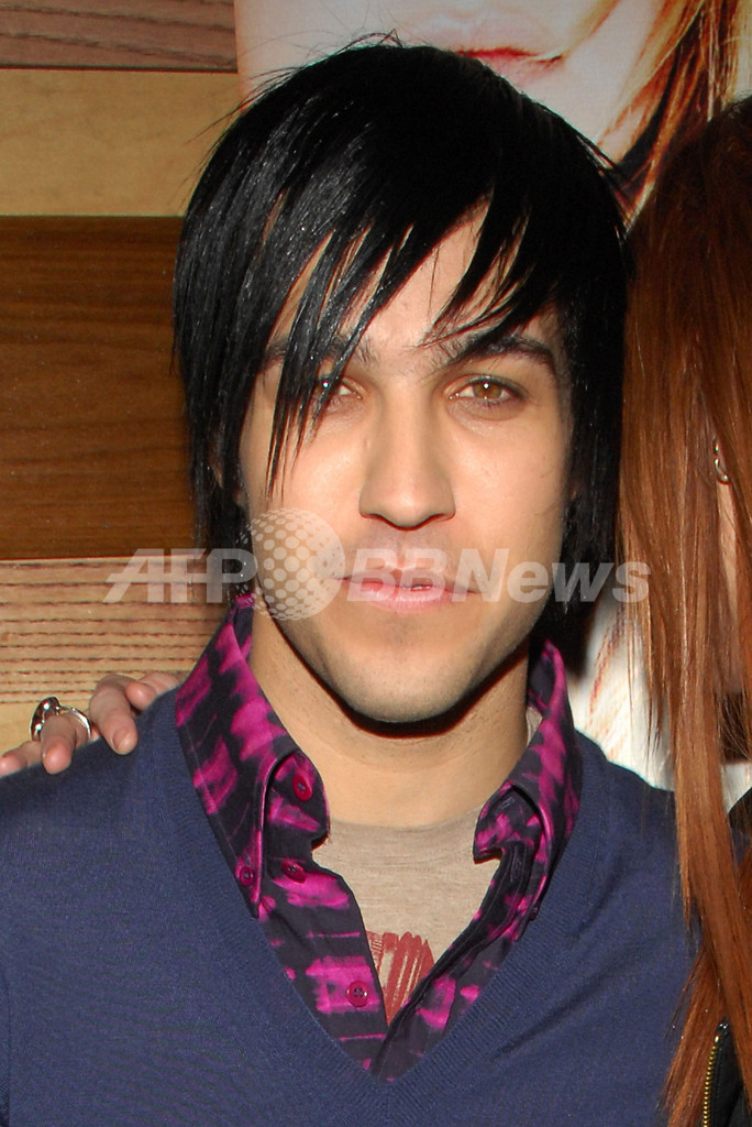 2008年2月26日、ニューヨーク市内のクラブ、Marqueeでニューアルバム『Bittersweet World』のパフォーマンスを行った歌手のアシュリー・シンプソン(Ashlee Simpson)の恋人のピート・ウェンツ(Pete Wentz)。(c)AFP/Getty Images/Rob Loud