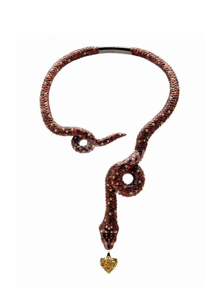 ブシュロンの人気モチーフ「スネーク」をチョコで形作り、ハート形にカットしたイエローダイヤモンドを先端に飾った。ブシュロン創業150周年である2008年にちなみ、ダイヤは20.08カラット。世界限定1点の「ショコラジュエリー」だ。芸術的なデザインに定評あるブシュロンならではのアイディアを、ラ・メゾン・デュ・ショコラの職人技が実現させた。