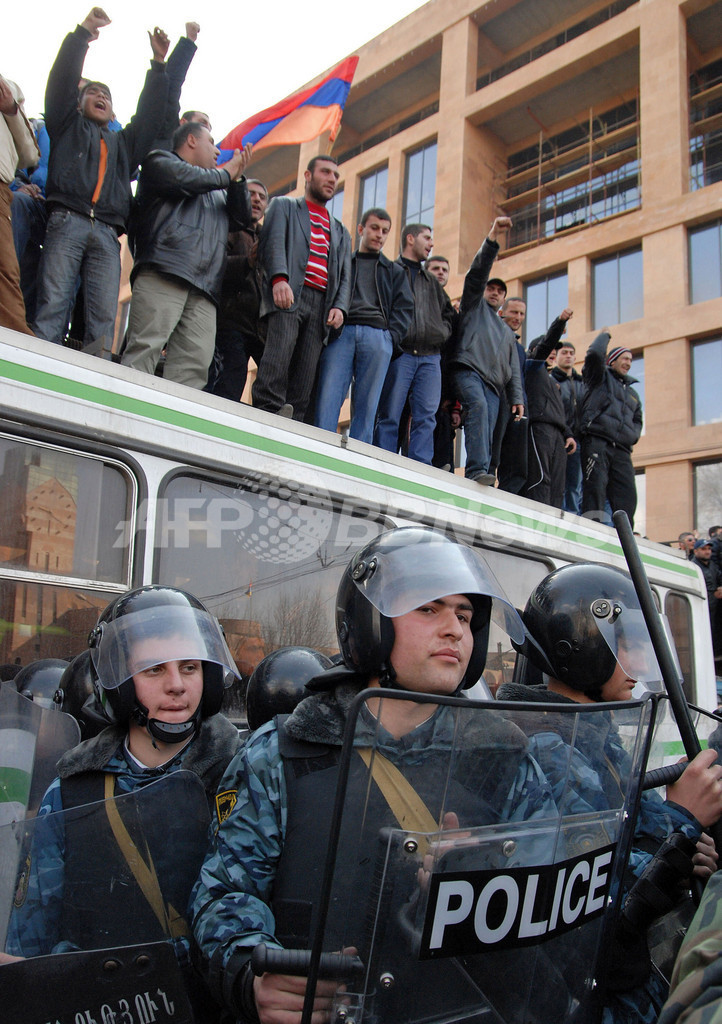 首都エレバン(Yerevan)の中央広場で1日に起きた警察部隊と約8000人の野党支持者らの衝突では、野党支持者らが火炎瓶や石を投げる中、警察部隊が催涙ガスや自動小銃を発砲するなどして応戦した。