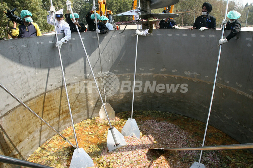 ニューデリーの競技場で、ギネスブックの認定員が監視する中、3トンのバスマティ米と唐辛子85キロ、1200リットルの食用油、そして野菜3650キロが、3台のクレーン車で巨大な容器に流し込まれた。
