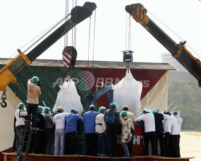 ニューデリーの競技場で、ギネスブックの認定員が監視する中、3トンのバスマティ米と唐辛子85キロ、1200リットルの食用油、そして野菜3650キロが、3台のクレーン車で巨大な容器に流し込まれた。