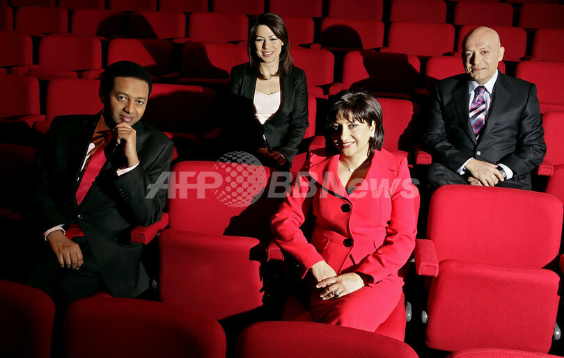 2008年3月3日、BBCの新ニュース・チャンネル「BBC Arabic Television」の放送開始発表イベントに登場したアンカーの(左から)Osman Ayfarah、Fida Bassil、Lina Musharbash、Tony El-Khoury。(c)AFP