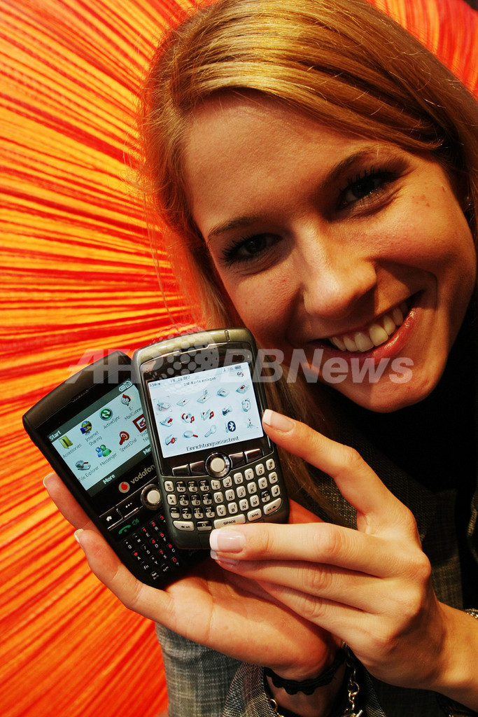 ドイツ中部ハノーバー(Hanover)で開催の情報技術見本市CeBITに出品されている、カナダメーカー、リサーチ・イン・モーション(Research in Motion Ltd.、RIM)が製造する「ブラックベリー(BlackBerry)」のニューモデル。(c)AFP/DDP/DAVID HECKER