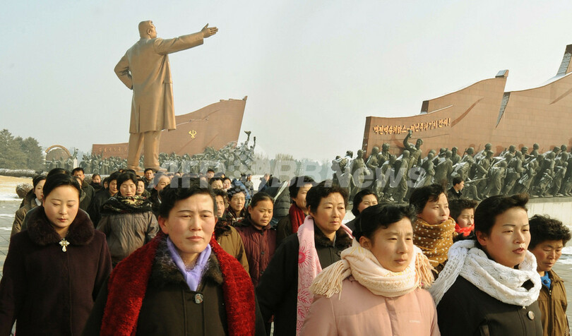 また、女性の一団が万寿台(Mansudae)講義堂の故・金日成(キム・イルソン、Kim Il-Sung)国家主席の銅像を参拝する姿も見られる。初代国家主席金日成氏は1994年の死後、息子の金正日(キムジョンイル、Kim Jong-Il)氏に権力が移った後も国民の崇敬を集めている。(c)AFP