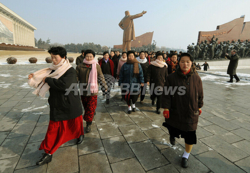また、女性の一団が万寿台(Mansudae)講義堂の故・金日成(キム・イルソン、Kim Il-Sung)国家主席の銅像を参拝する姿も見られる。初代国家主席金日成氏は1994年の死後、息子の金正日(キムジョンイル、Kim Jong-Il)氏に権力が移った後も国民の崇敬を集めている。(c)AFP