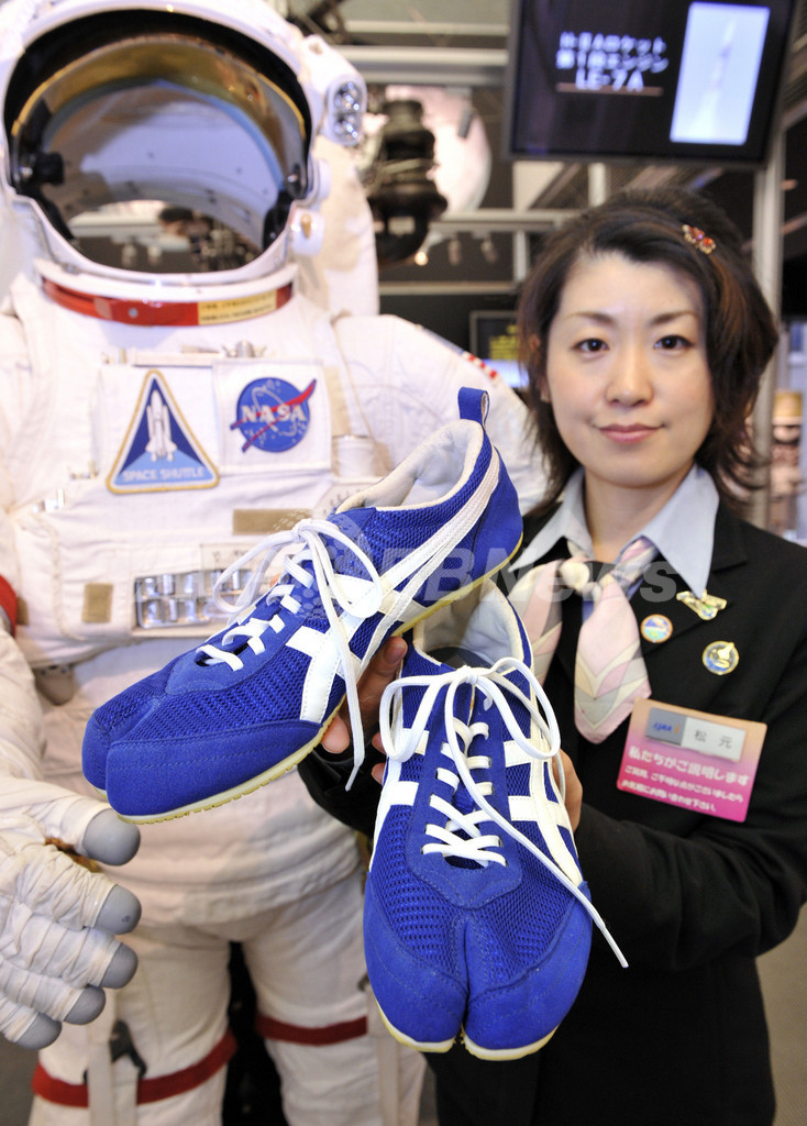 宇宙用の運動靴は足袋のようにつま先部分が2つに分かれているのが特徴。運動靴は2月に都内で開催された展示会で披露された。