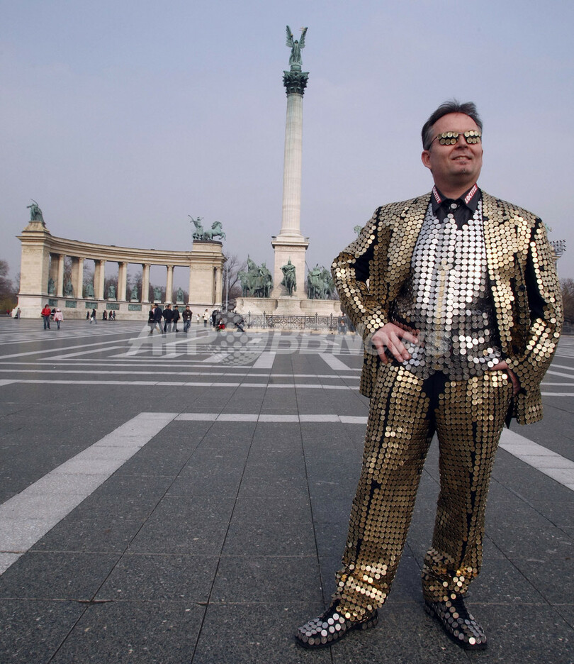 【3月11日 AFP】ハンガリーのグラフィック・アーティスト、T-BoyことTibor Gaalさんが、接着剤で硬貨をつなぎ合わて制作したスーツからネクタイ、靴までの服装一式を披露し、話題を呼んでいる。これは「tie of coins」と題されたGaalさんの作品で、接着剤メーカーがスポンサー。ハンガリーでは1日より1フォリントと2フォリントの硬貨が使用できなくなっており、これを受けてGaalさんは硬貨を用いたスーツなどを制作したという。(c)AFP