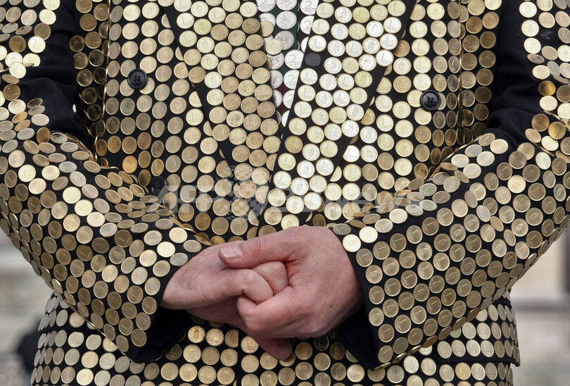 【3月11日 AFP】ハンガリーのグラフィック・アーティスト、T-BoyことTibor Gaalさんが、接着剤で硬貨をつなぎ合わて制作したスーツからネクタイ、靴までの服装一式を披露し、話題を呼んでいる。これは「tie of coins」と題されたGaalさんの作品で、接着剤メーカーがスポンサー。ハンガリーでは1日より1フォリントと2フォリントの硬貨が使用できなくなっており、これを受けてGaalさんは硬貨を用いたスーツなどを制作したという。(c)AFP