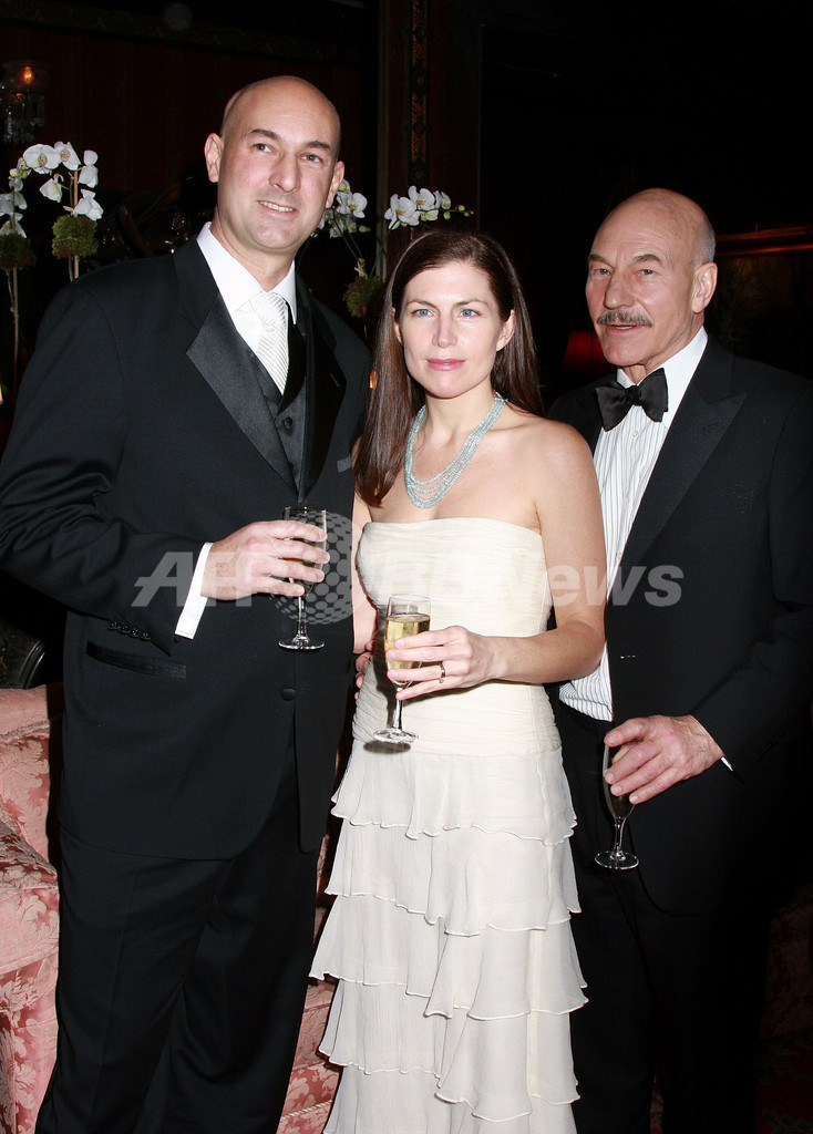 2008年3月10日、ニューヨーク(New York)のナショナル・アーツ・クラブ(National Arts Club)でポーズを取る、(左から)俳優のダニエル・スチュワート(Daniel Stewart)、メアリー・スチュワート(Mary Stewart)、2008年サー・ジョン・ギールグッド賞(2008 Sir John Gielgud Award)を受賞した俳優のパトリック・スチュワート(Patrick Stewart)。(c)AFP/Getty Images/Will Ragozzino