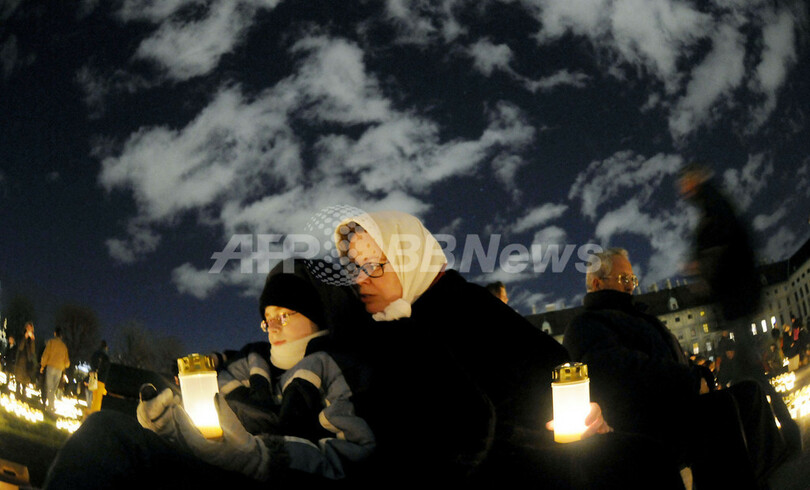 犠牲者1人ひとりのために1本ずつのろうそくがともされ、約8万本のろうそくが広場を埋めた。自身もオーストリア人だったアドルフ・ヒトラー(Adolf Hitler)は70年前の1938年3月12日、民衆約25万人から支持を受け、オーストリアの併合を宣言した。(c)AFP