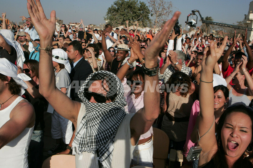 2008年3月14日、アルジェリア人歌手のシェブ・ハレド(Cheb Khaled)とフランス語ラップの先駆的グループIAMによってギザのピラミッド前で行われた無料のコンサートに駆けつけた人々。(c)AFP/CRIS BOURONCLE