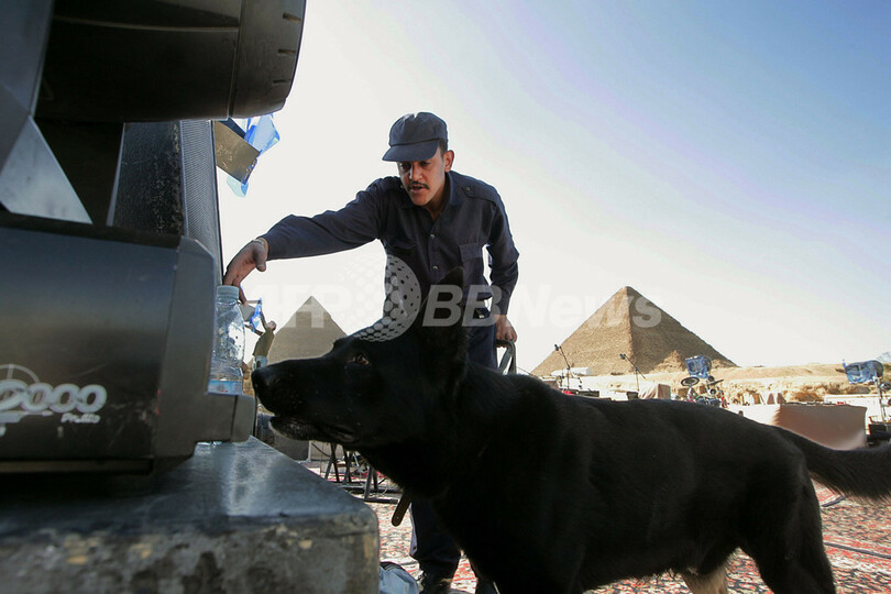 2008年3月14日、ギザのピラミッド前で行われたアルジェリア人歌手のシェブ・ハレド(Cheb Khaled)とフランス語ラップの先駆的グループIAMのコンサート前に爆発物を探知する犬。(c)AFP/CRIS BOURONCLE