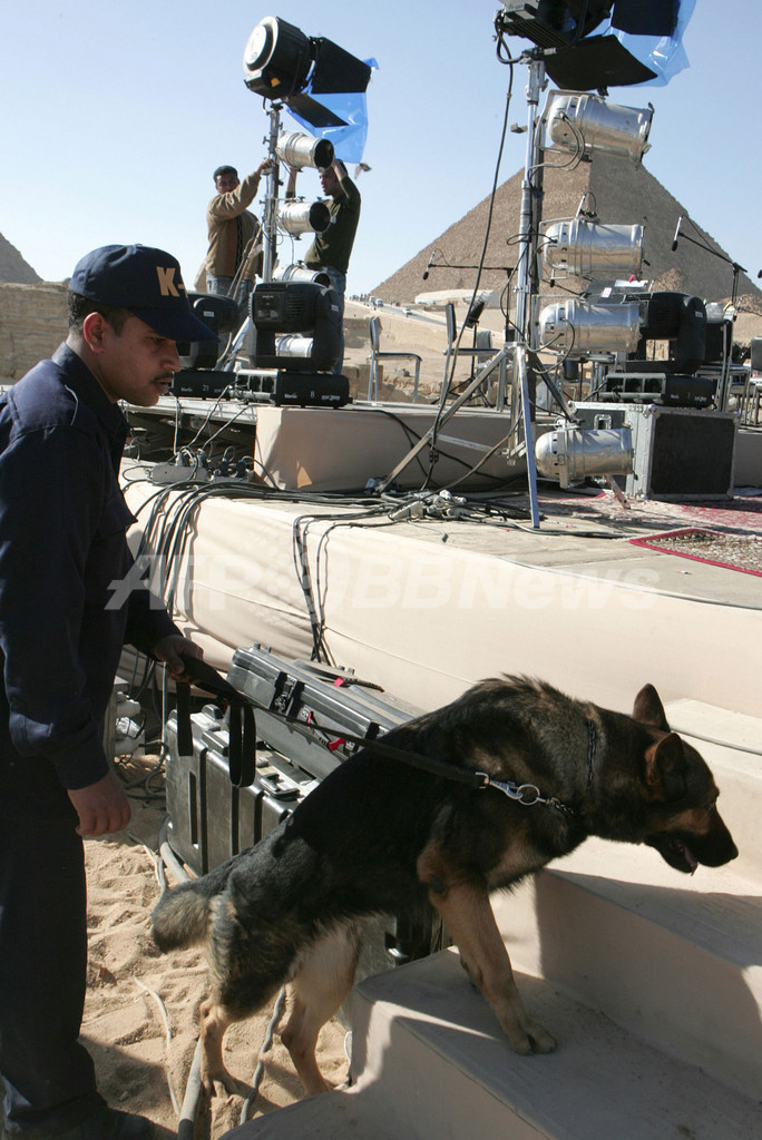 2008年3月14日、ギザのピラミッド前で行われたアルジェリア人歌手のシェブ・ハレド(Cheb Khaled)とフランス語ラップの先駆的グループIAMのコンサート前に爆発物を探知する犬。(c)AFP/CRIS BOURONCLE