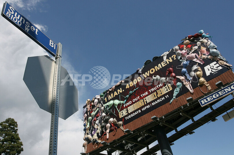 2008年3月15日、サンセット大通り(Sunset Boulevard)に登場した、ハードロック・バンドKISSのジーン・シモンズ(Gene Simmons)の実生活を追ったリアリティー番組「Gene Simmons Family Jewels」新シーズンの巨大看板。(c)AFP/Getty Images/Valerie Macon